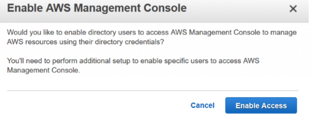 - This enables AWS Management Console access for your AWS Microsoft AD directory and provides you with a URL that you can use to connect to the console.